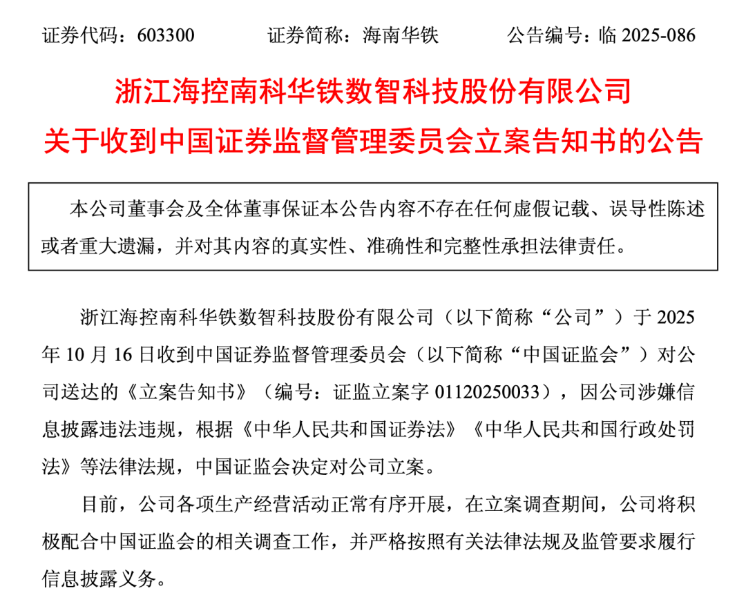 10月16日晚間,海南華鐵(603300)公告,公司收到中國證監(jiān)會對公司送達(dá)的《立案告知書》,因公司涉嫌信息披露違法違規(guī),中國證監(jiān)會決定對公司立案。目前,公司各項生產(chǎn)經(jīng)營活動正常有序開展。
