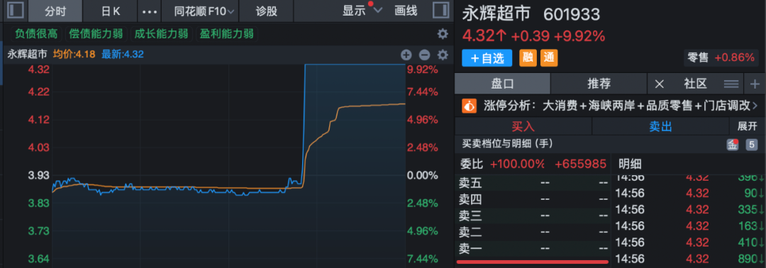 市場熱點方面,一般零售概念午后走強,板塊指數(shù)盤中在13:50左右突然放量直線拉升,盤中一度漲近3%。永輝超市在13:48還微幅飄綠,僅約3分鐘則垂直拉至漲停,成交額較前一交易日激增近200%,供銷大集、中百集團、步步高等午后也出現(xiàn)異動拉升走勢。