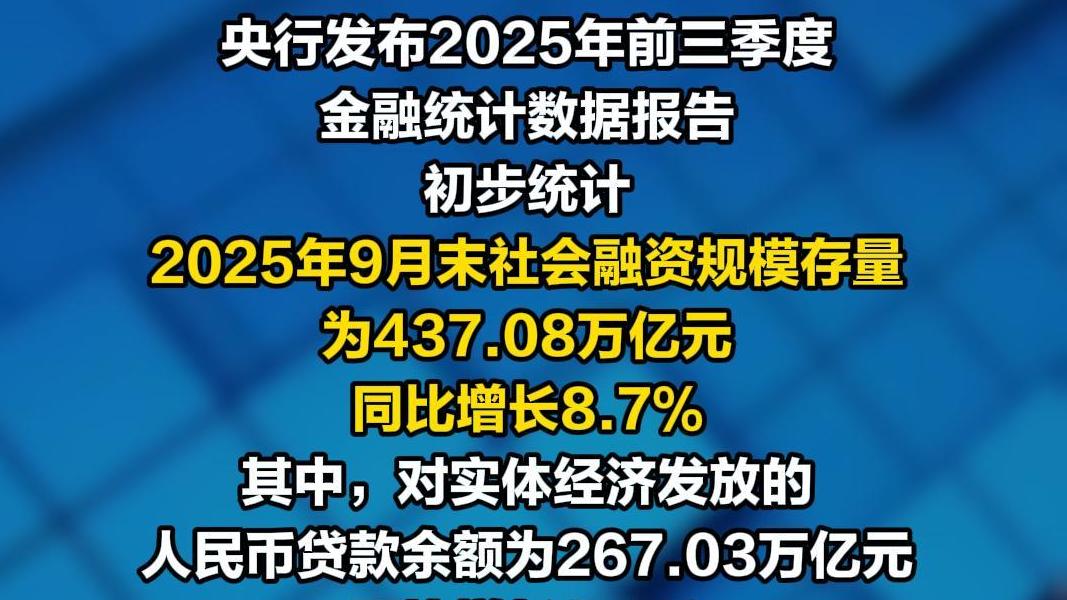 央行:2025年9月末社會(huì)融資規(guī)模存量為437.08萬(wàn)億元,同比增長(zhǎng)8.7%